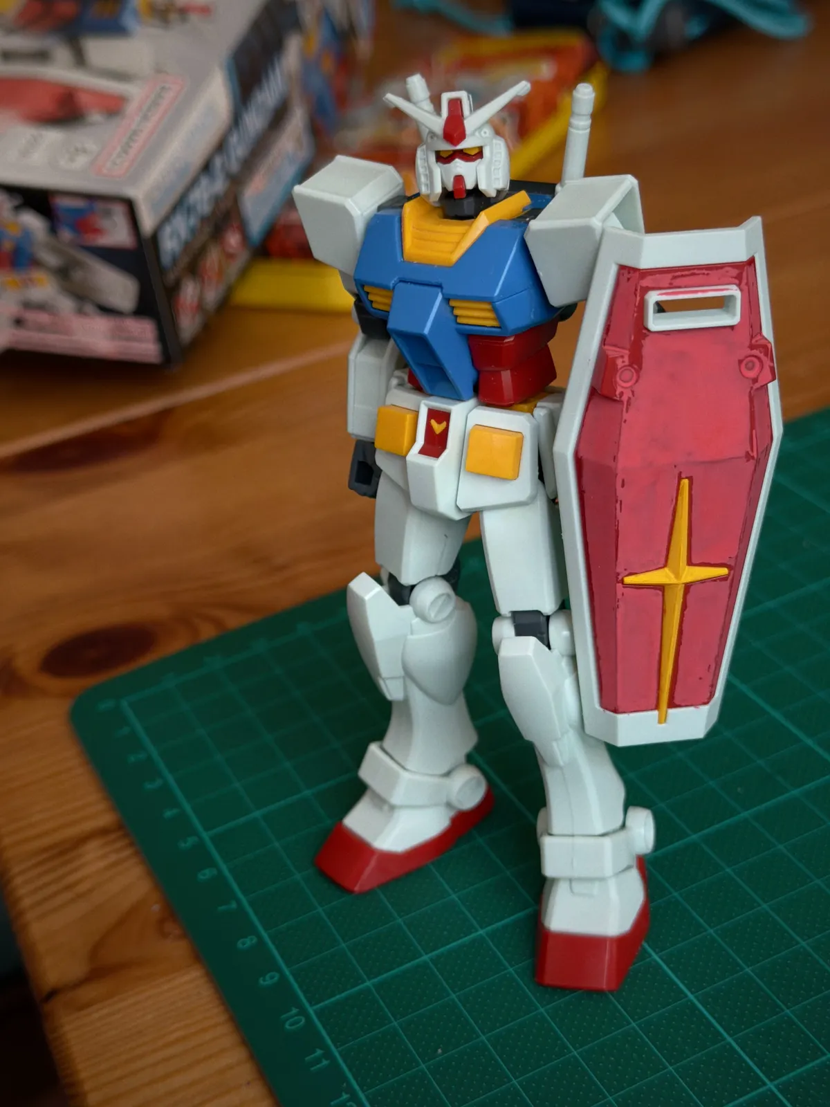 I built the beginner grade kit of the RX-78-2 from Gundam. Painted it's sield using markers—it looks shit; one person said, it looks like deliberate weathering—, and want to use it to test a few things like panel lining or getting rid of seam lines.
